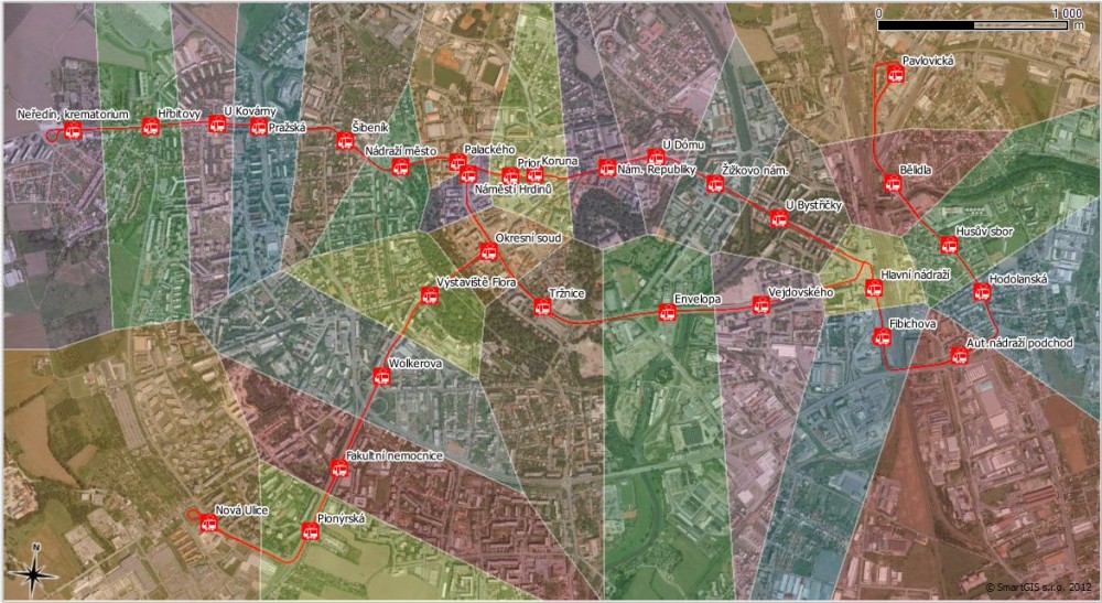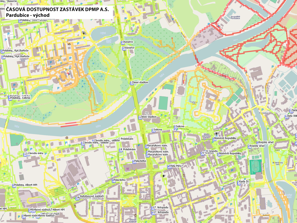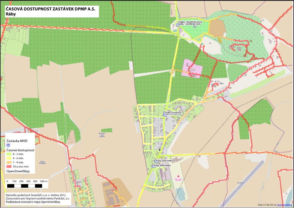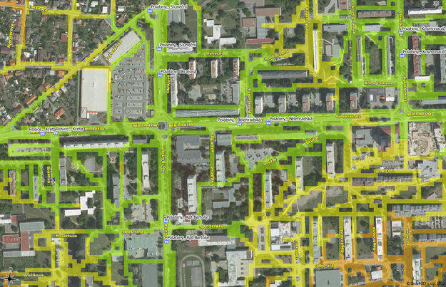 Na rozdiel od bežne využívaných buffer zón (kružníc okolo zastávok) je dostupnosť počítaná reálnou vzdialenosťou po línii uličnej siete, nie vzdušnou vzdialenosťou.