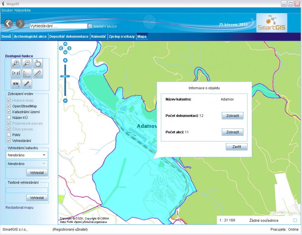 Užívatelia si prostredníctvom mapového modulu môžu jednotlivé archeologické akcie vyhľadávať a prehľadne vizualizovať podľa katastrálneho územia, ale aj podľa ID akcie či konkrétnej oprávnenej archeologickej organizácie.